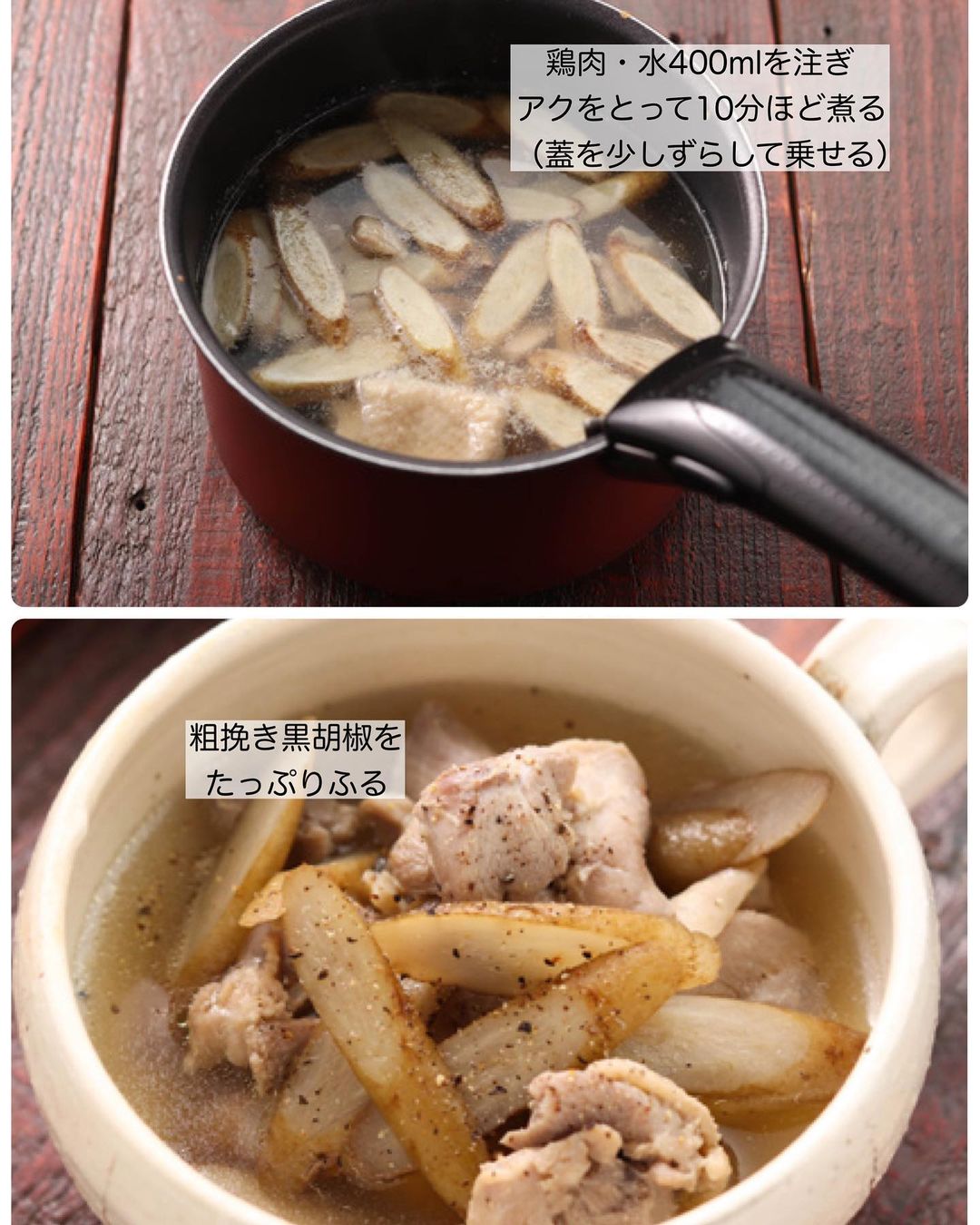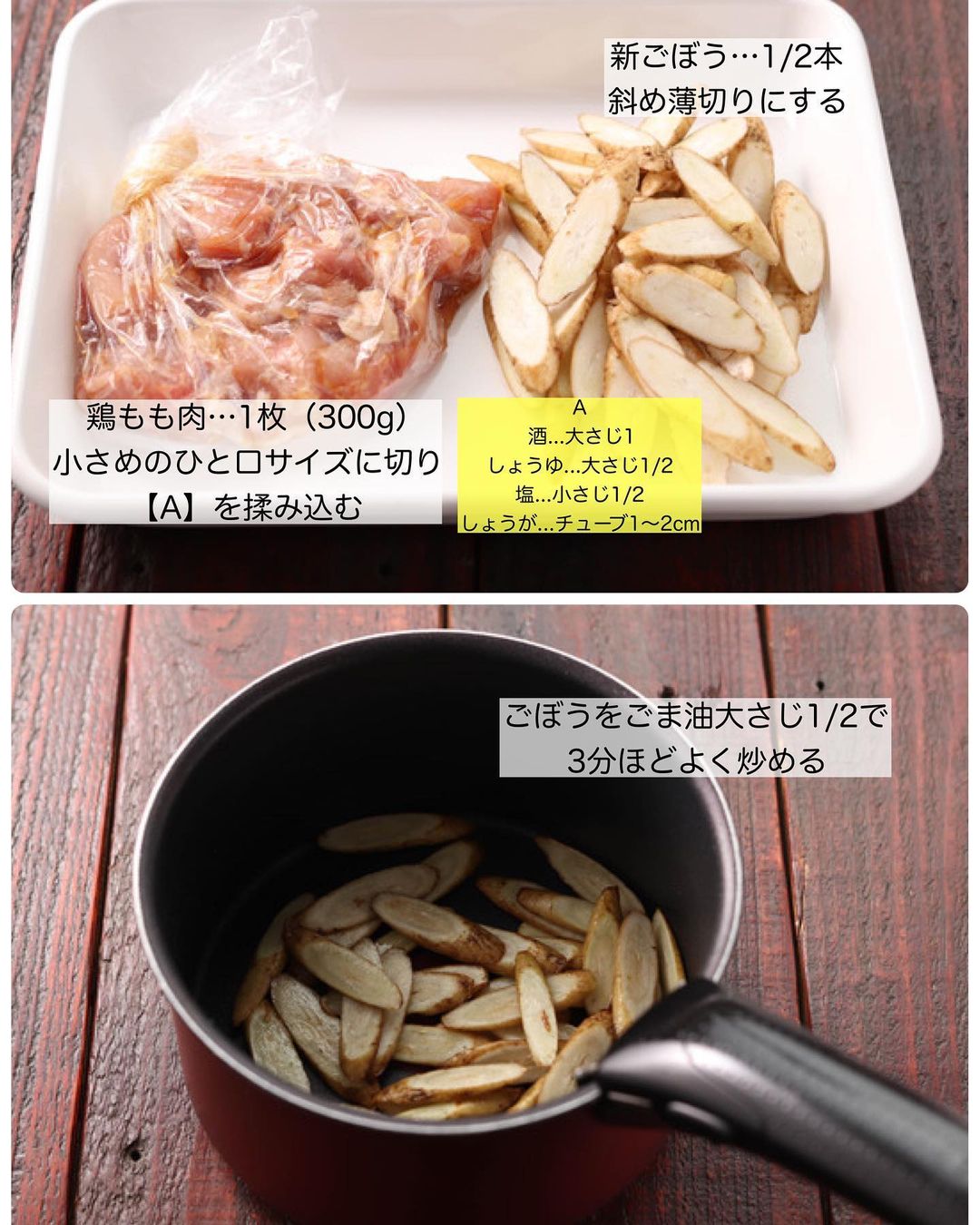➊鶏肉は小さめのひと口サイズに切って【A】を揉み込む。新ごぼうは斜め薄切りにし、水に5分ほどさらして水気を切る。