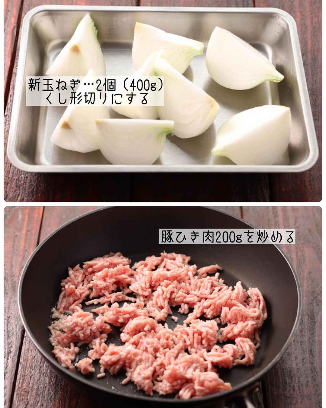 ➋フライパンにサラダ油を中火で熱し、豚ひき肉を炒める。ひき肉の色が変わったら、【A】・1を入れ、蓋をして15分ほど煮る。時々ヘラなどで混ぜる。