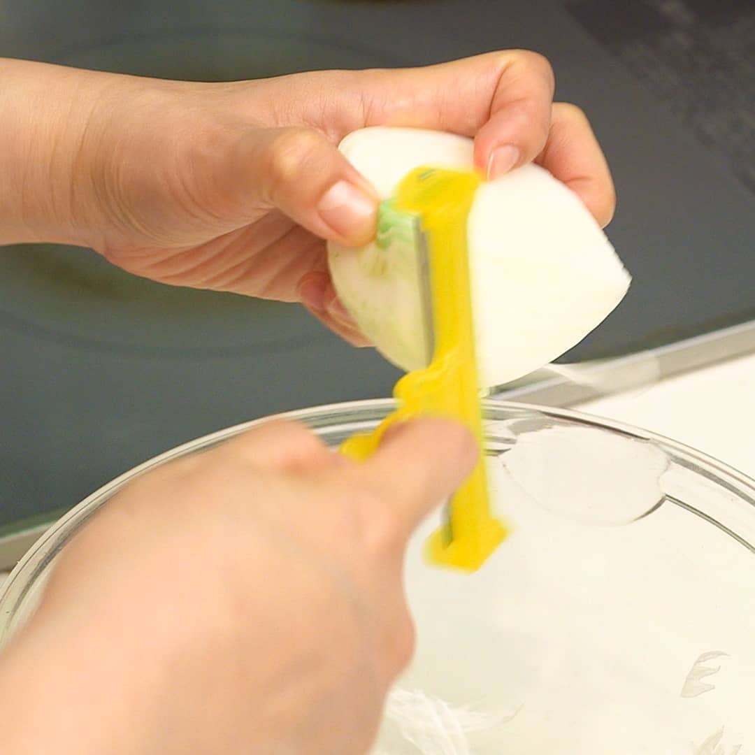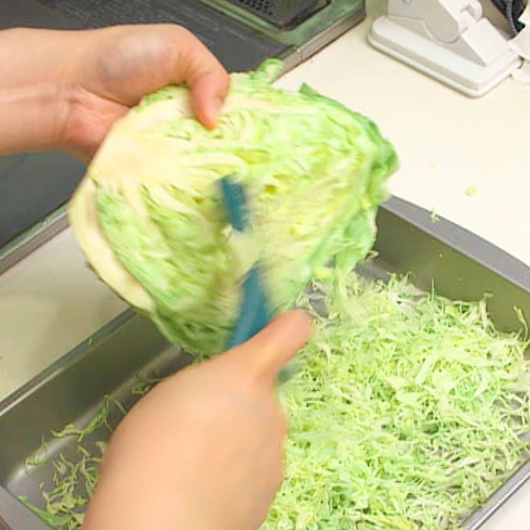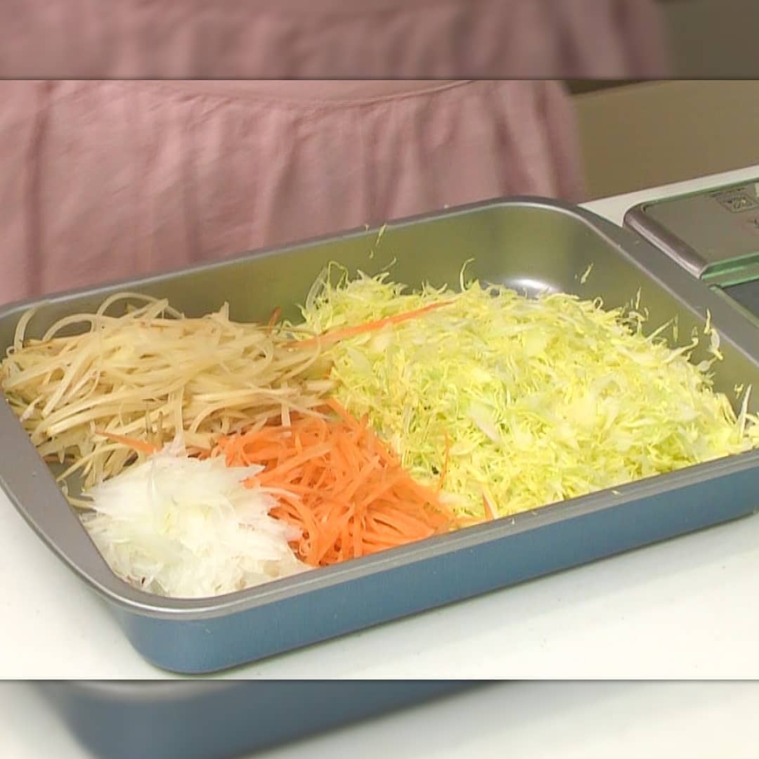 ①新玉ねぎ1/4個をスライス、春キャベツ1/4玉を千切りにする