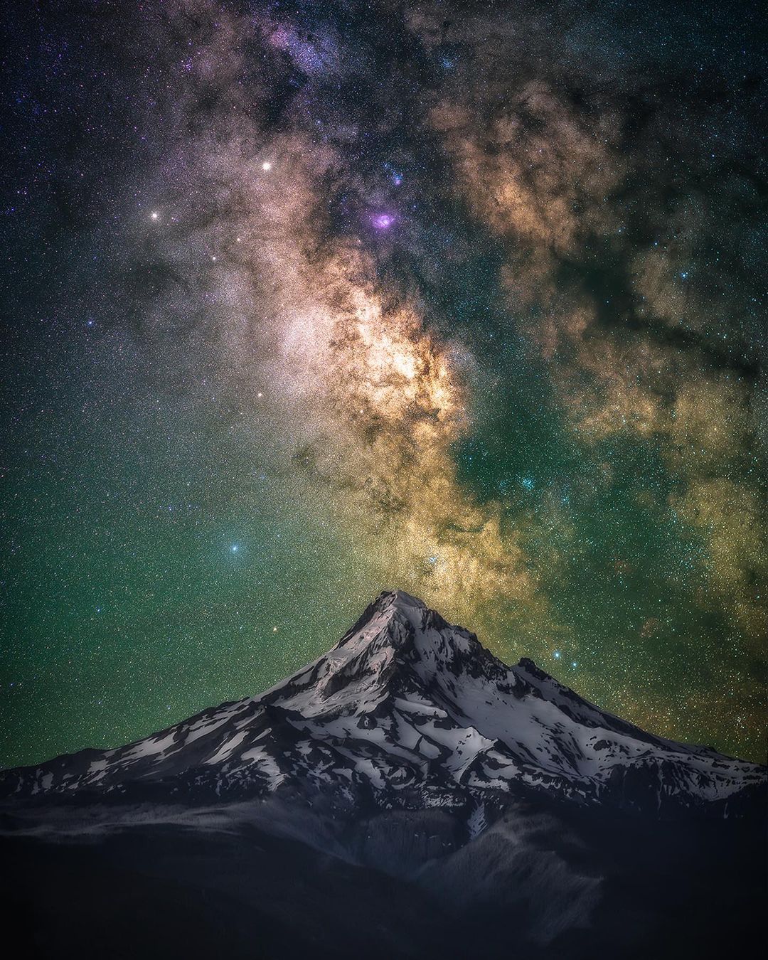 This shot was captured on a short one-night backpacking trip near Mt. Hood at the beginning of Milky Way season. It was my first time really using the Slik ECH-630 astro tracker on my CF-733 carbon fiber tripod. I couldn’t believe the detail I was able to achieve. The composite image was captured in the same location on the same night. Sometimes, I think that simple shots are the most effective. I used my 55mm lens on this one to get an intimate view of the Milky Way gliding past Mt. Hood, keeping the shot nice and simple.
