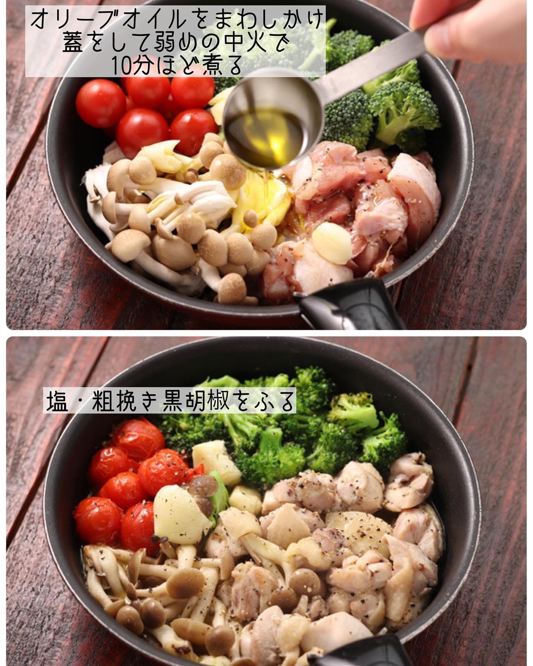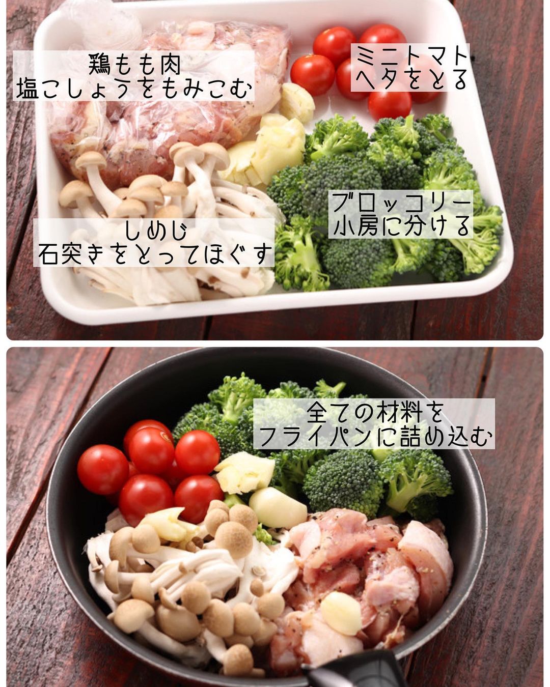 ➊鶏肉はひと口サイズに切って【A】を揉み込む。ブロッコリーは小房に分ける。しめじは石づきをとってほぐす。ミニトマトはヘタを取る。にんにくは包丁の腹で潰す。