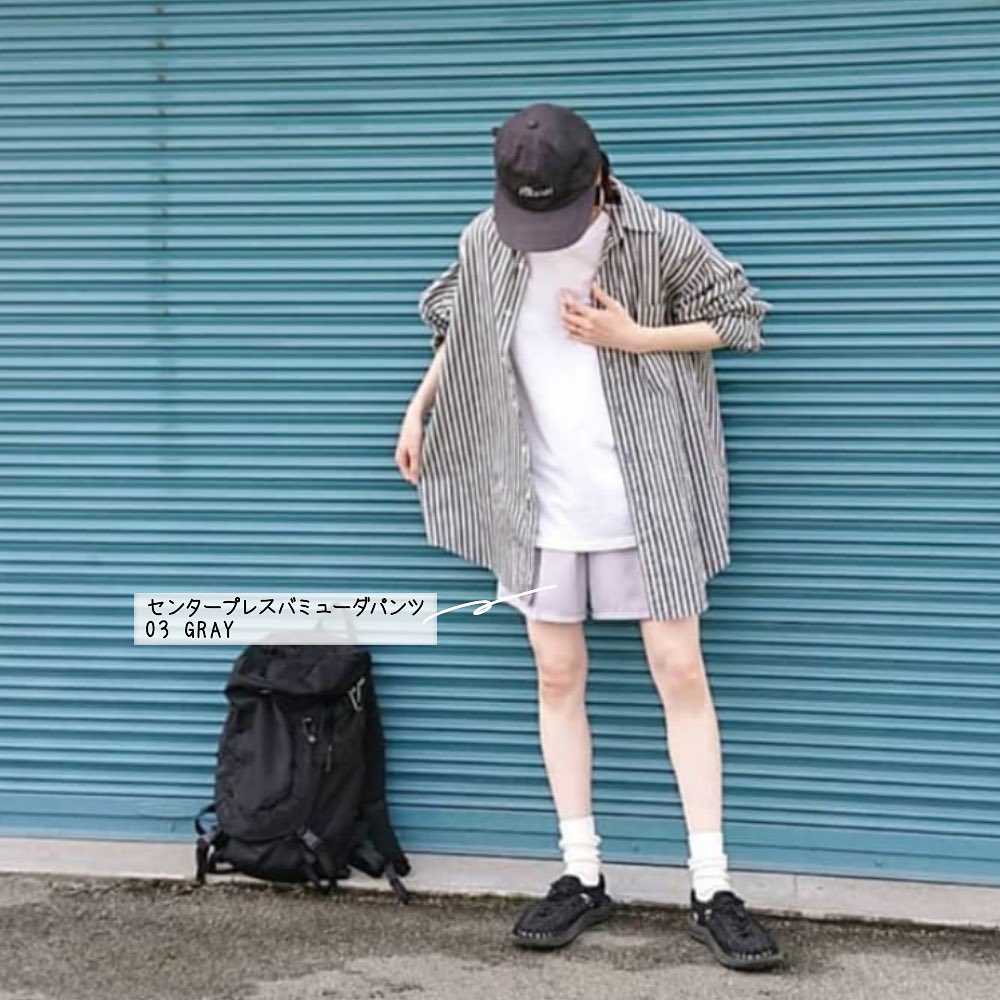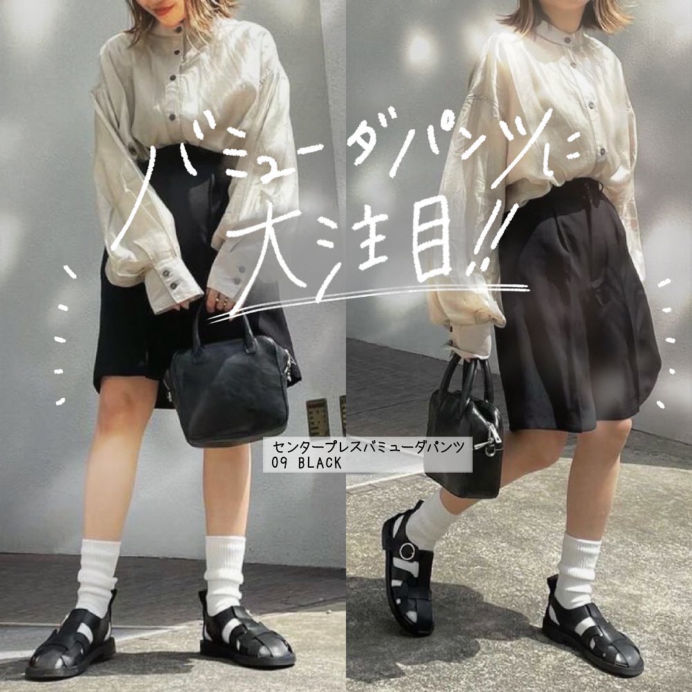 膝よりちょっと上の丈感も可愛いバミューダパンツ✨テロっとした素材感と、センタープレスのデザインだから、落ち着いた雰囲気にも着こなせるGOODなアイテム👍