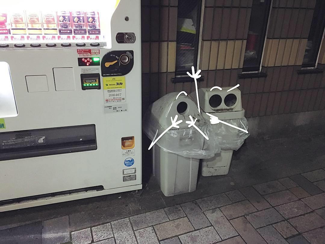 1年前にフランスから日本にやってきたMattias Husser (@tokyowatchers) さんの目に映る東京という街には、ゴミ箱星人がたくさん潜んでいる。特に缶とペットボトルを仕分ける可愛らしいタイプのやつ。「ゴミ箱たちの姿を見ると、何かを物語っている気がするんだ。この街のきれいを守る、頼もしいやつら。ボロボロになってもなお立ち続けてるのとか、酔っ払っているように見えるのとか、すごくいいと思う。人間を見守りながら、僕たちと一緒にこの街に住んでいるんだ」街の至るところで自動販売機を見つけては、その横でちょこんと立っているリサイクル用のゴミ箱を撮影しているMattiasさん。写真をシェアする前に加えるお絵かきには、彼なりのこだわりが。「なるべく腕と眉毛だけ描くようにしてるんだ。時どきタバコとか涙とかを描き入れることもあるけど、見る人の想像力に任せたほうが面白みがあっていいと思うから」