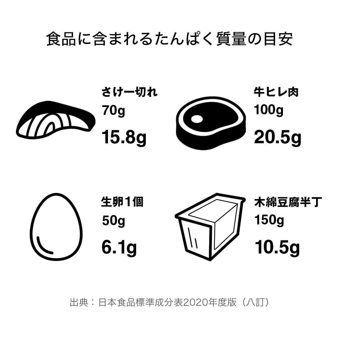 1日に摂取するたんぱく質の推奨量は、18歳以上の男性で約60g 女性で約50g 必要とされています。