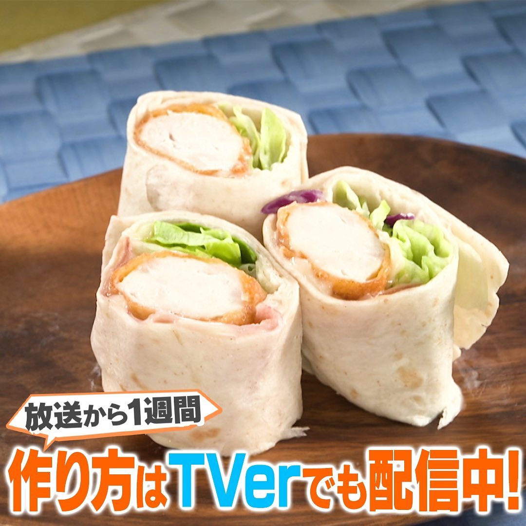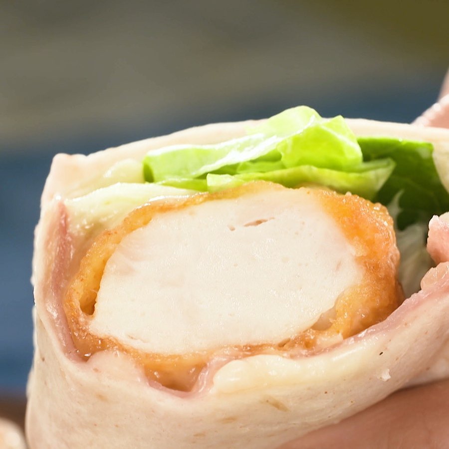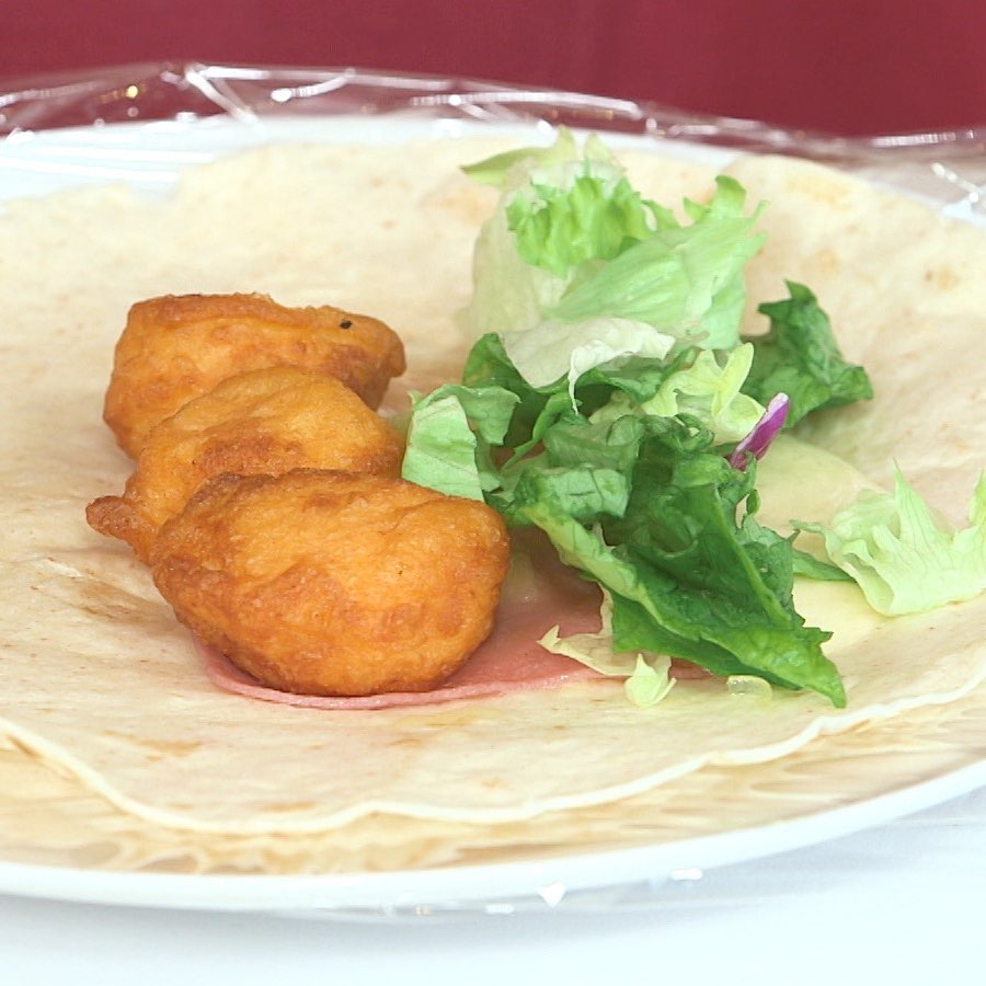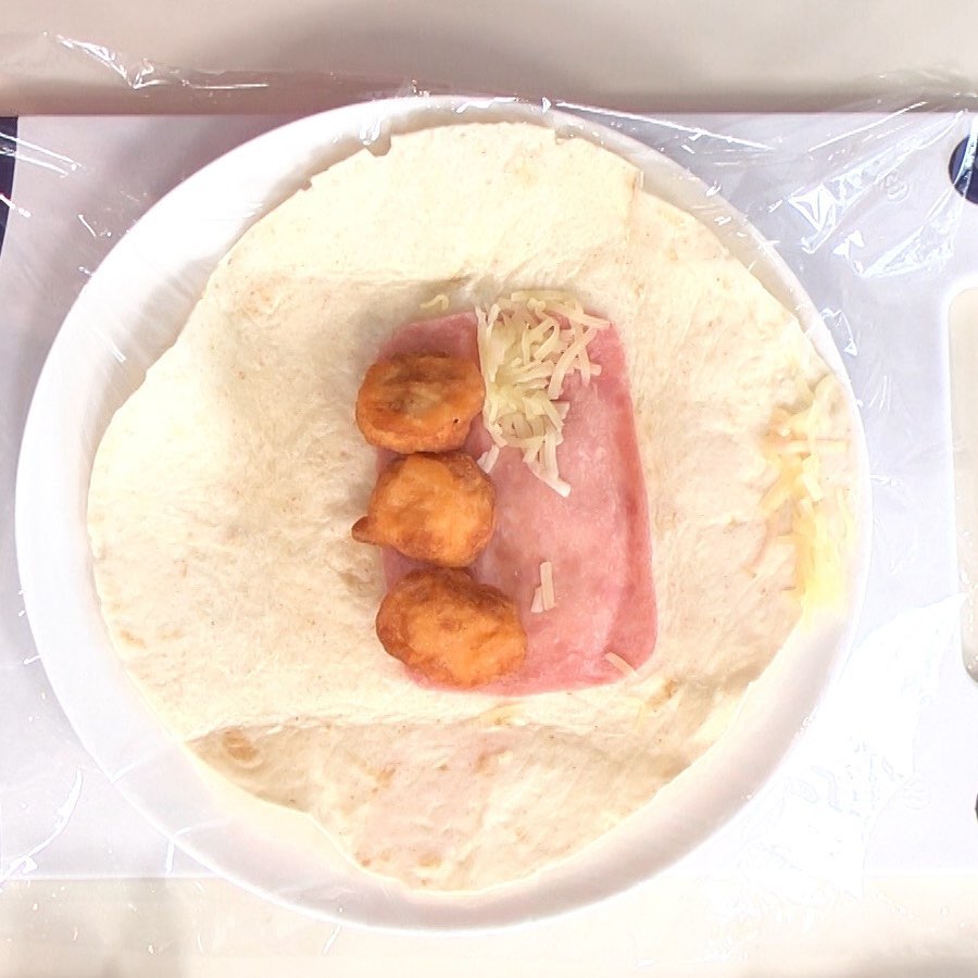 ②袋から出したトルティーヤ ハム&4種のチーズ(1個)を破れないように開き、その上にからあげクン(3個)を縦に並べる