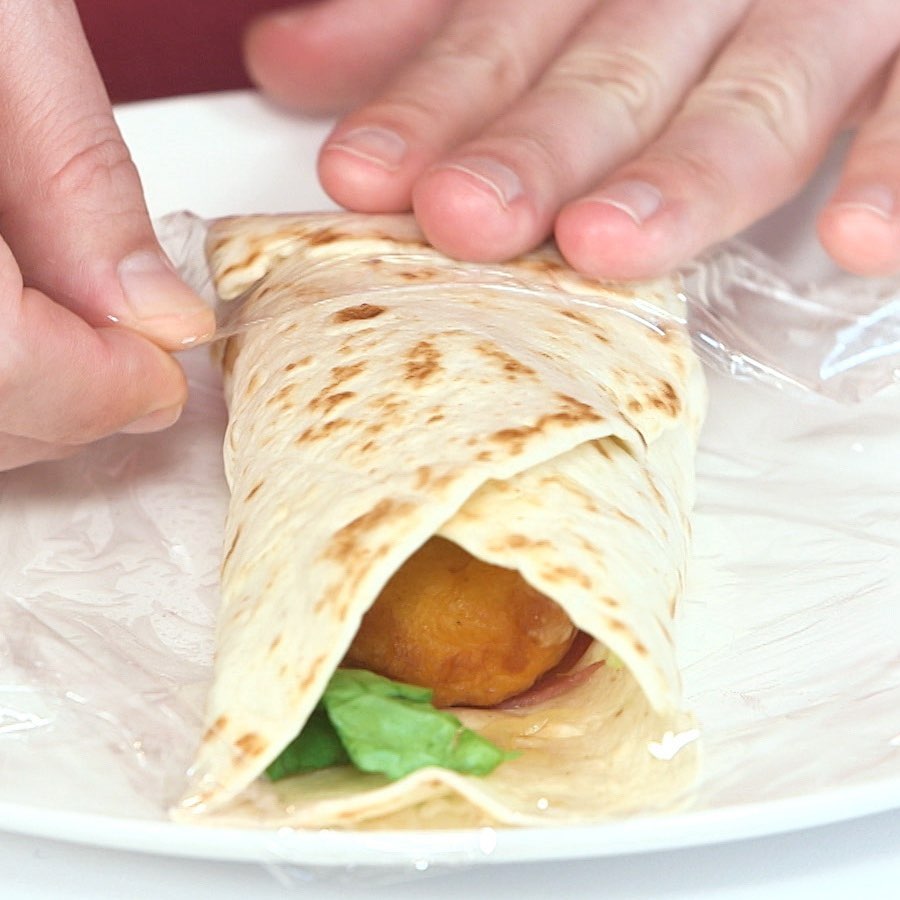 ④下に敷いたラップを利用して左(レタス)からトルティーヤごと内側に折り込む。反対側から、また上下も折り込んだらしっかり押さえる。