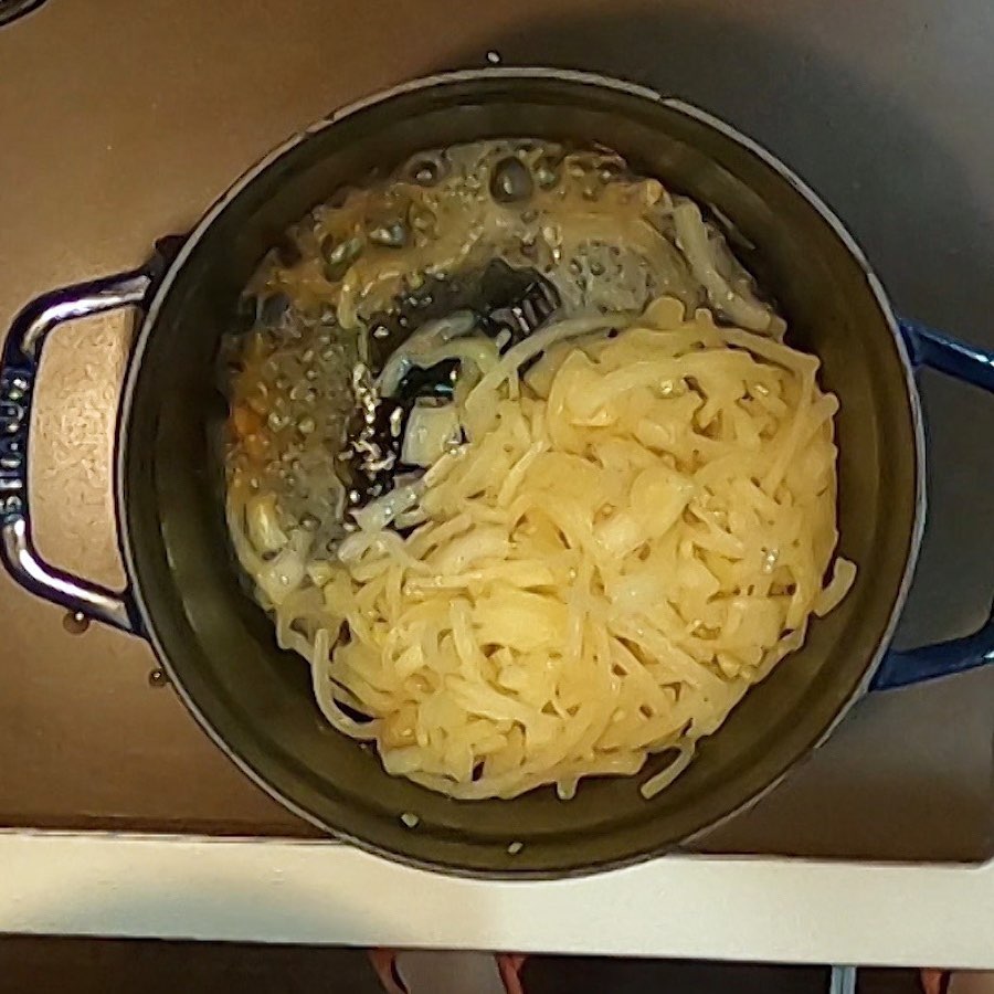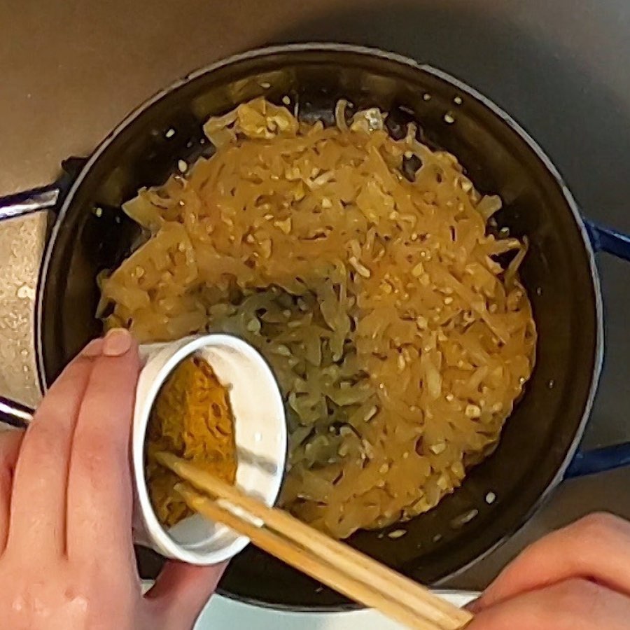 ②薄切りにした玉ねぎと塩(小さじ1/2)を入れ、中火でしんなりするまで炒める。しんなりしたら、カレー粉(約大さじ2)、下準備したしょうが、にんにくを加え、弱火でじっくりと炒める