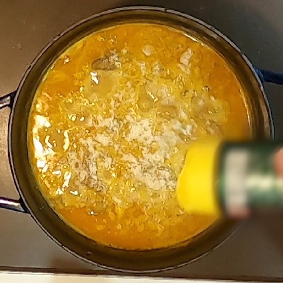 ⑤カレー粉(約大さじ1)を入れ、味をみて塩(適量)黒コショウ(適量)で味を調え、生クリーム(100ml)を加える