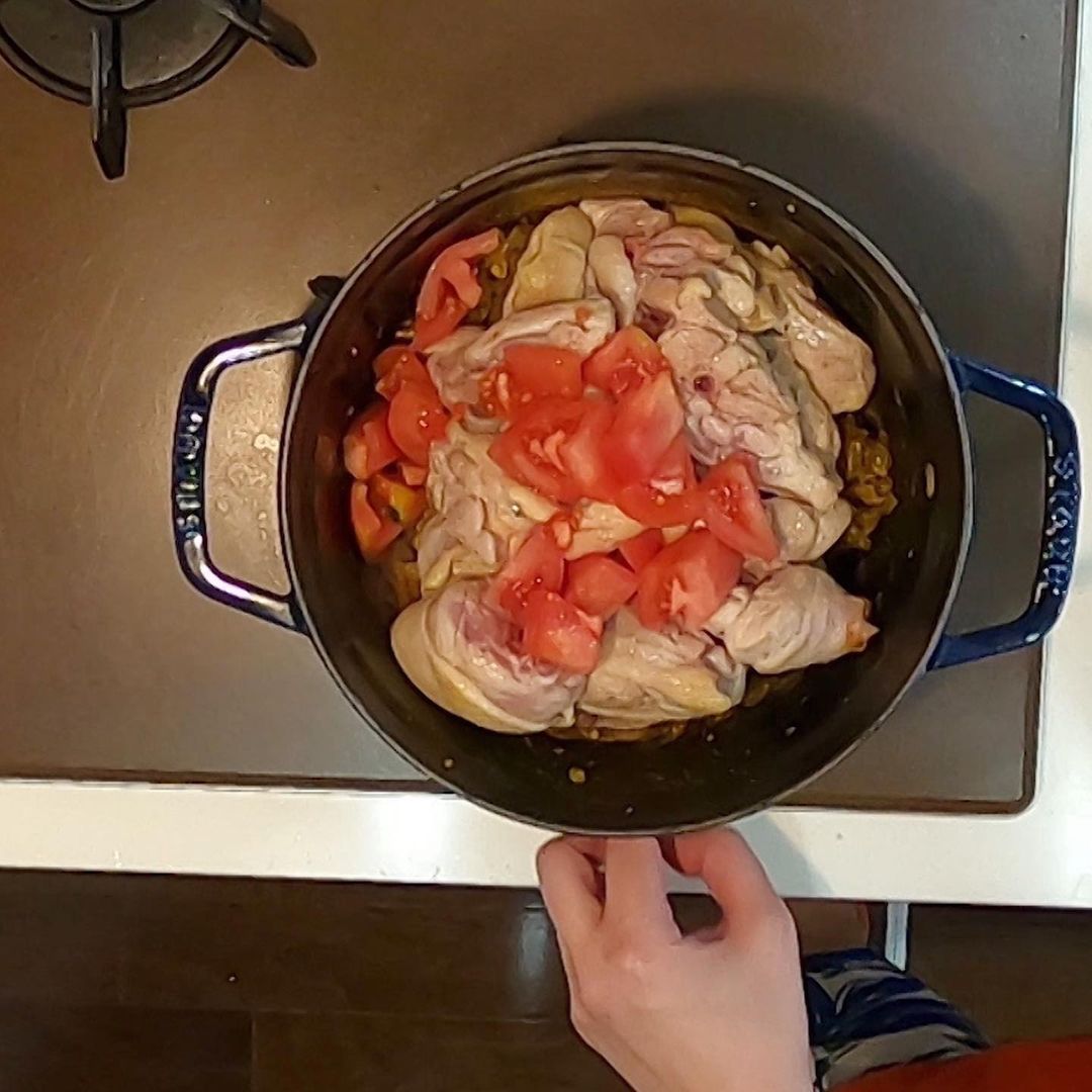 ③さらに、ざく切りにしたトマトと鶏肉を加え、なじませたら、水(400ml)、塩(小さじ1)、シナモンスティック(5cm)を加え、火を強める