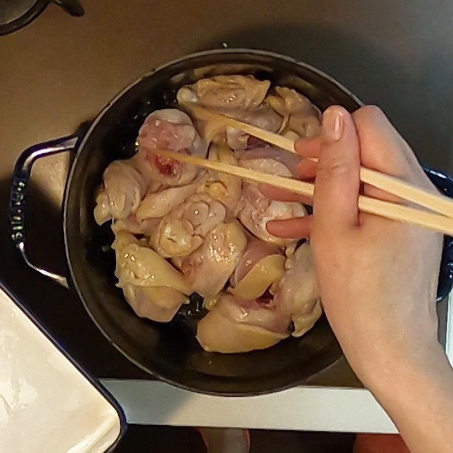 ①サラダ油(大さじ1)を熱した鍋に鶏肉を入れ、中火で焼き色がつくまで焼き、取り出す