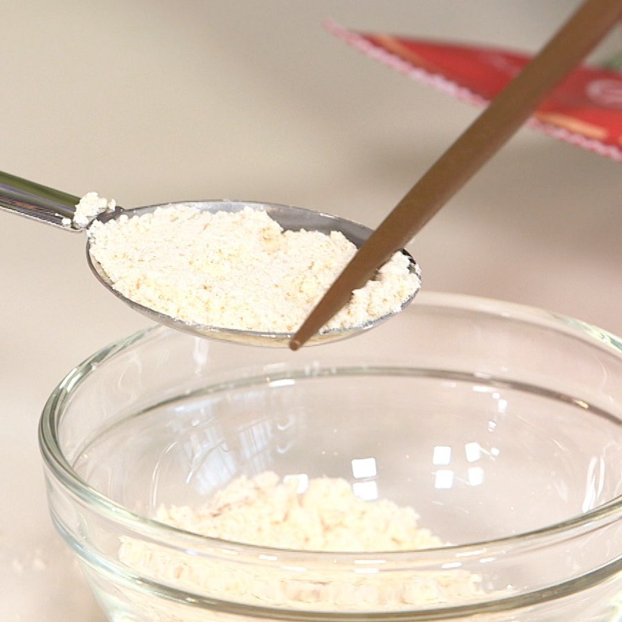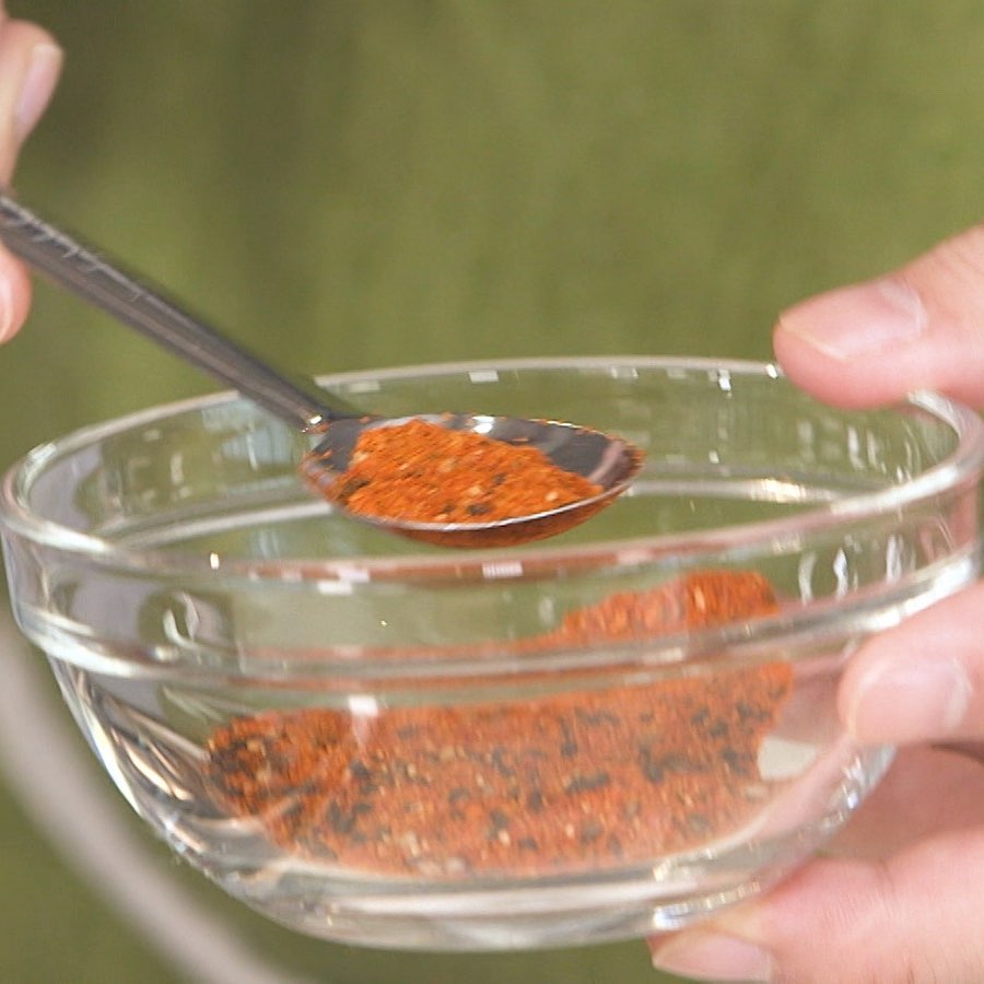 ②皿に七味唐辛子(小さじ1/2)オニオンスープの素(大さじ1と1/2)を入れる