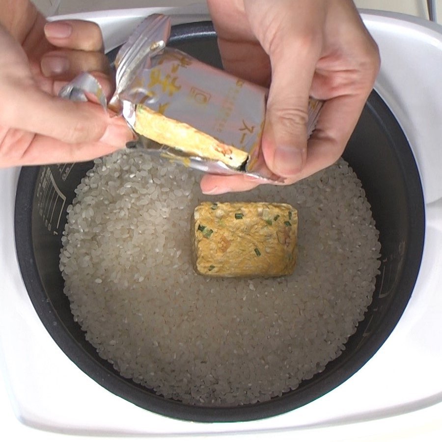 ②フリーズドライのたまごスープの素(2個)を入れ、水を2合の目盛りまで入れる