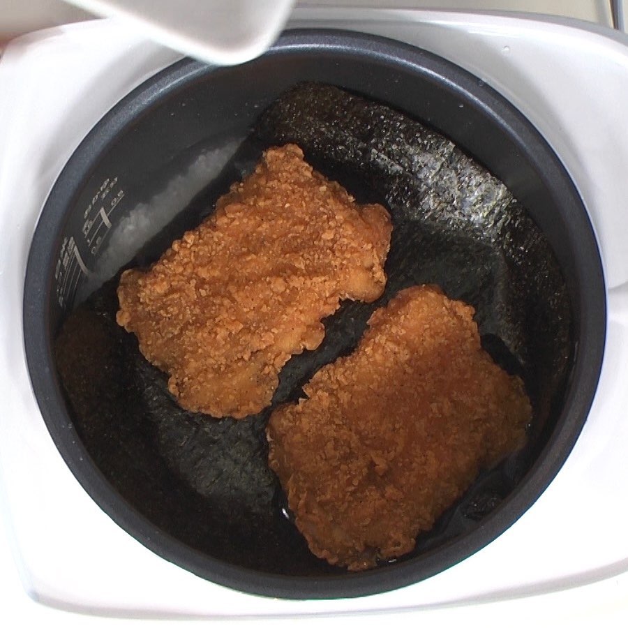 ③その上に板のり2枚、ファミチキ(2個)を載せて炊く