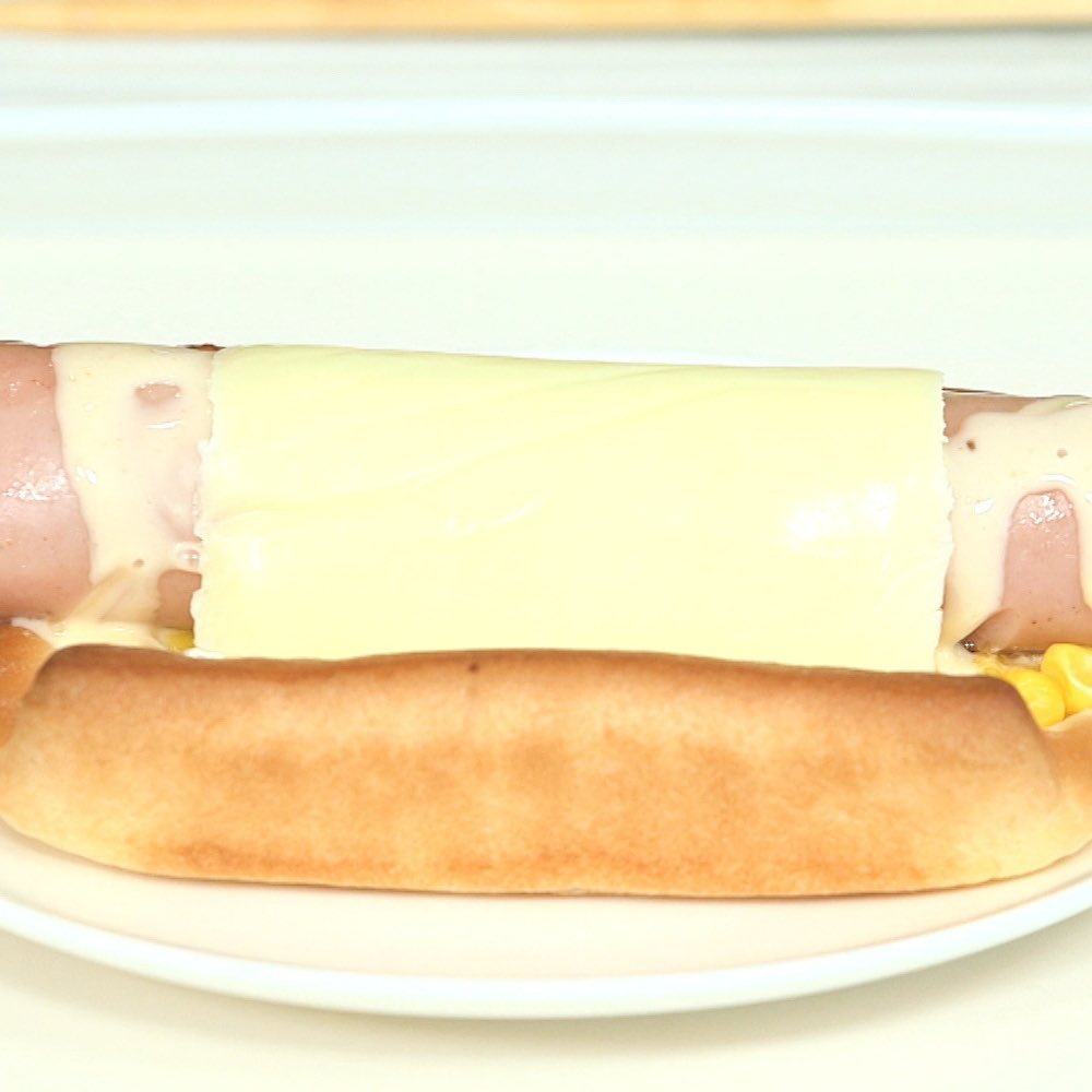 ①「なつかしのつぶつぶコーン」パンの上にBIGポークフランクをのせ、串を引き抜く