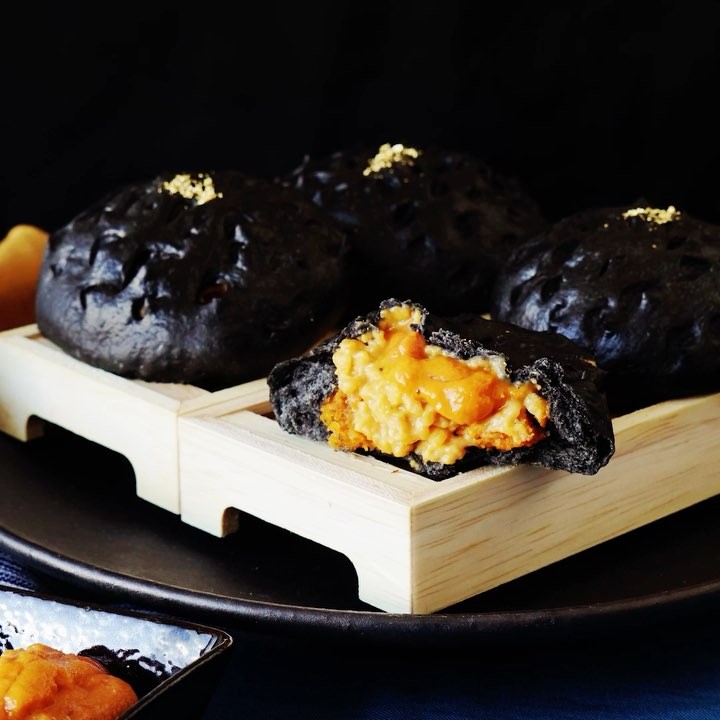 5.黒い生地を4等分にし、生地を広げウニクリームとウニを包む