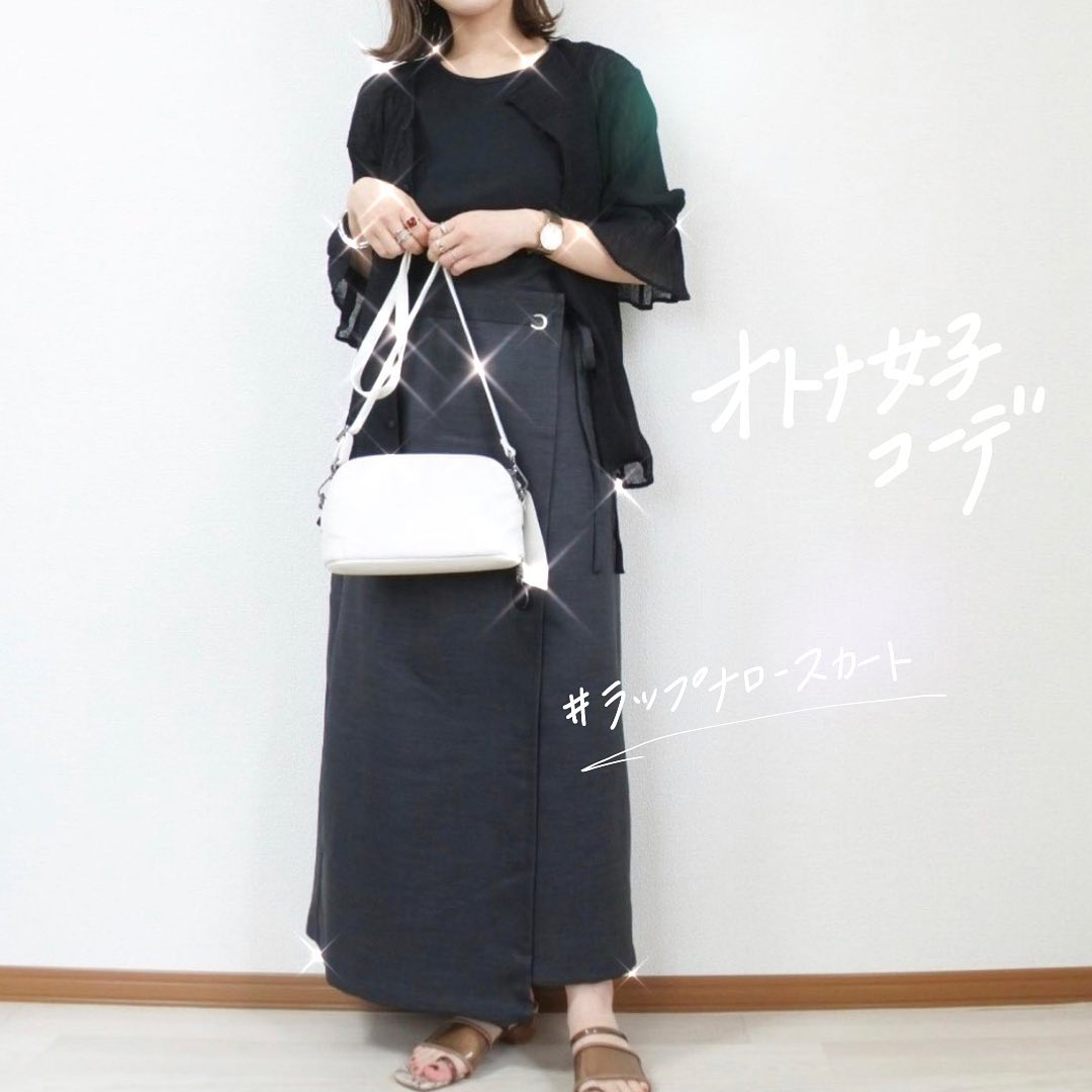 ダークカラーでも、ラップ風デザインのスカートが抜け感をだしてくれて、軽めにまとまっていますね👌足元も爽やかで、春らしいオトナ女子😘コーデの主役になる、オシャレ見えスカート✨是非、チェックしてみてくださいね💁♀️💕