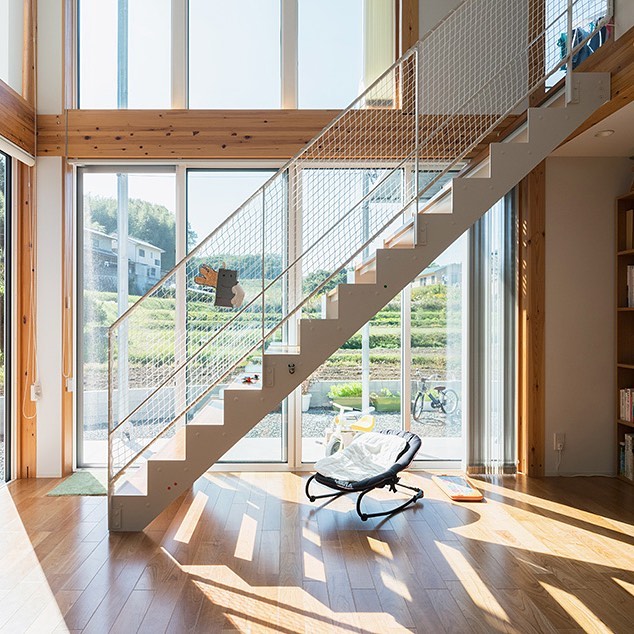 「リビングの陽だまりでごろごろしたり、スケルトン階段で座ったり。家中を使って遊びまわっています」とご夫妻は笑顔で話します。