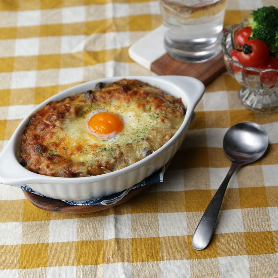 5. 耐熱皿にごはんをしき、細切りチーズをたっぷりとのせる。(4) をのせて、中央にくぼみをつくって卵をのせて、180℃のトースターで10-15分焼く。