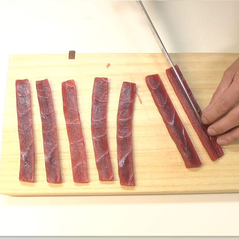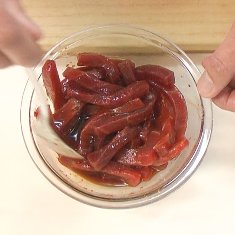④マグロを細長く切ったら、たれに馴染ませる