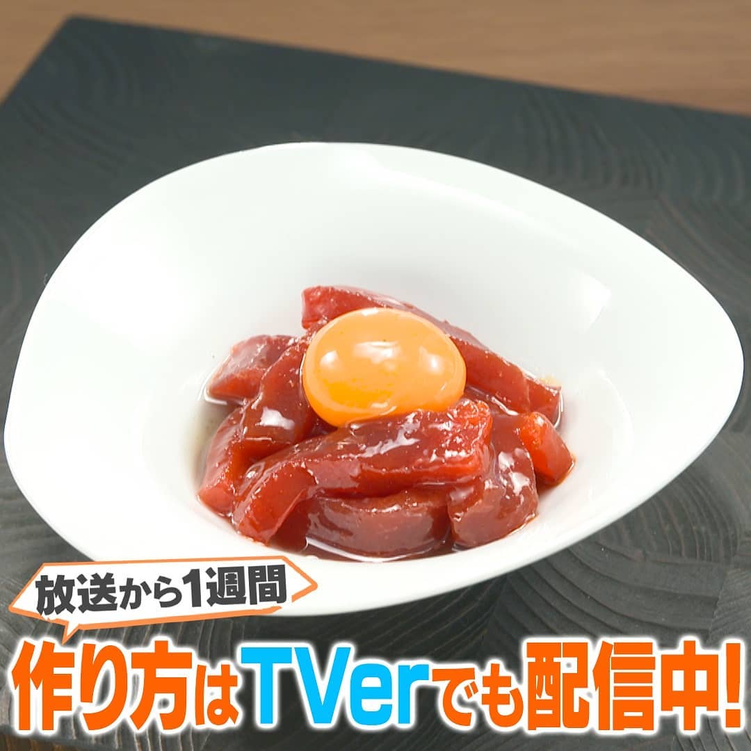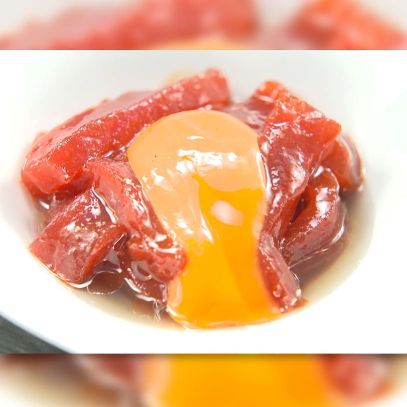 ⑤漬け込んだマグロをお皿に盛り卵黄(1個)を乗せ、ゴマとアーモンドのオイルをかけたら完成