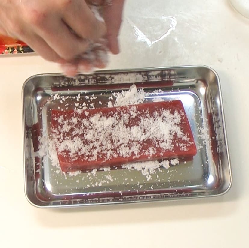 ①砂糖(大さじ1)をマグロ全体にまぶし、水分と臭みを取る