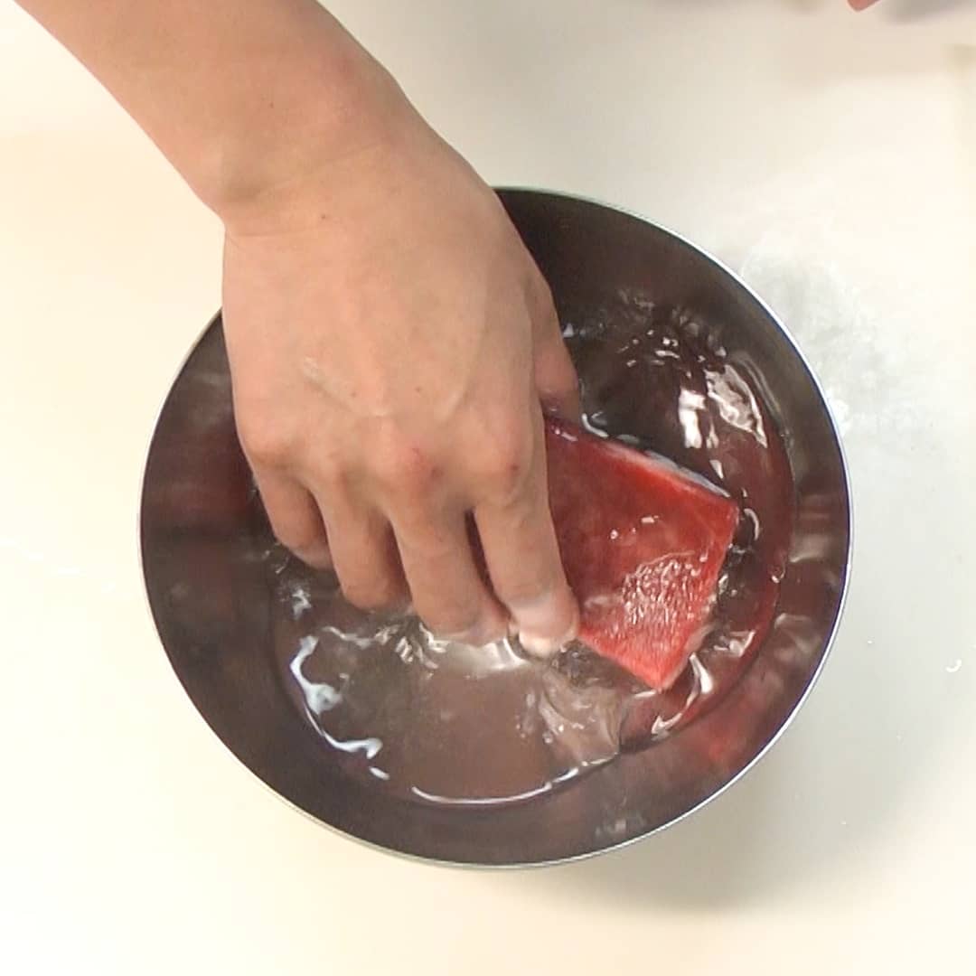 ②塩水(ひとつまみ)で洗い流し、キッチンペーパーで拭き取ったら冷蔵庫で冷やす