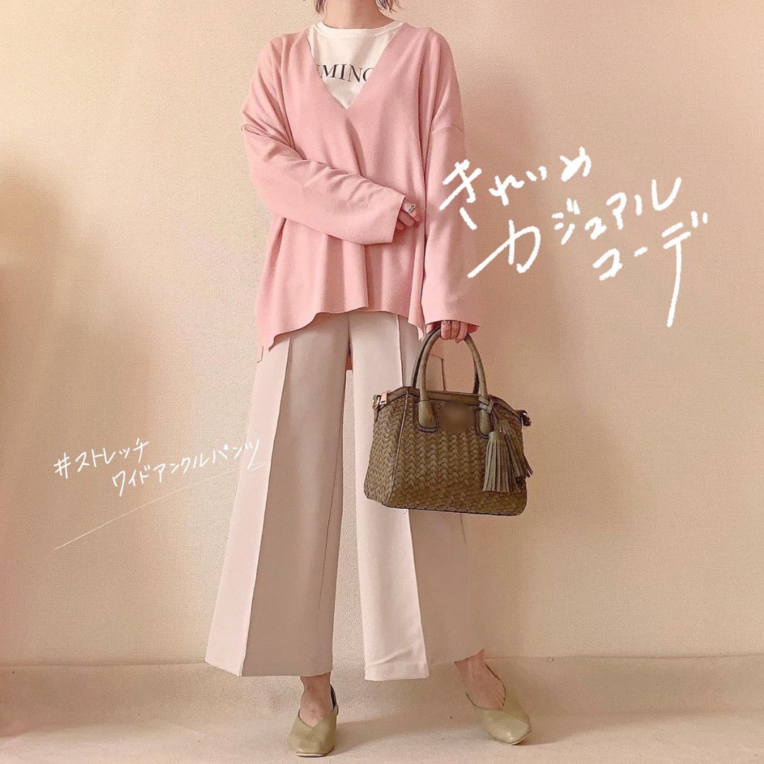 ストンと落ちるラインで、脚長効果✨可愛らしい色合いをストレートにまとめた、大人の女性にしっくりくるコーデに仕上がっていますね🥰センターラインが、スタイルアップを実現するワイドパンツ👏是非、チェックしてみてくださいね💁♀️💕