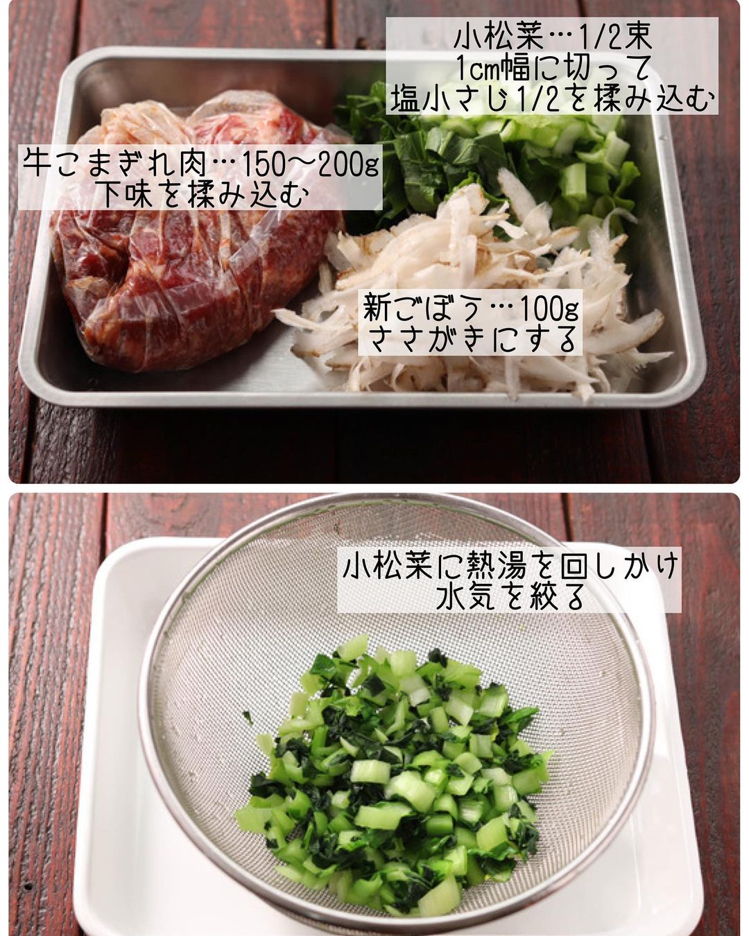 ➊牛肉は【A】を揉み込み、ごぼうはピーラーでささがきに(細切りにしてもOK)し、水に5分ほどさらして水気をきる。小松菜は1cm幅に刻んで塩を揉み込み、10分ほどおいたら熱湯600mlを回しかけて水気を絞る。
