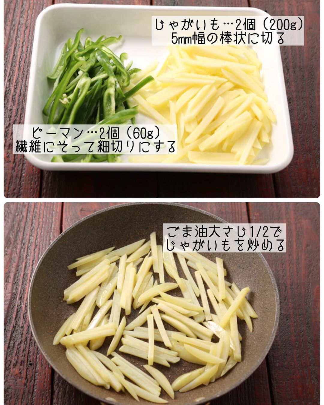 ➊じゃがいもは5mm幅の棒状に切って水に5分ほどさらす。ピーマンは種とヘタを取り除き、繊維にそって細切りにする。