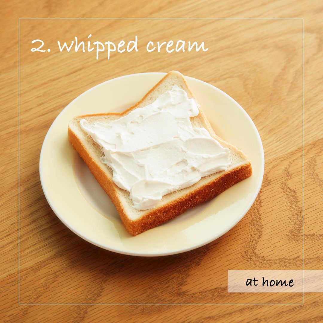 ①ふわふわ食パン6枚切りにお好みの量のホイップクリームをのせる