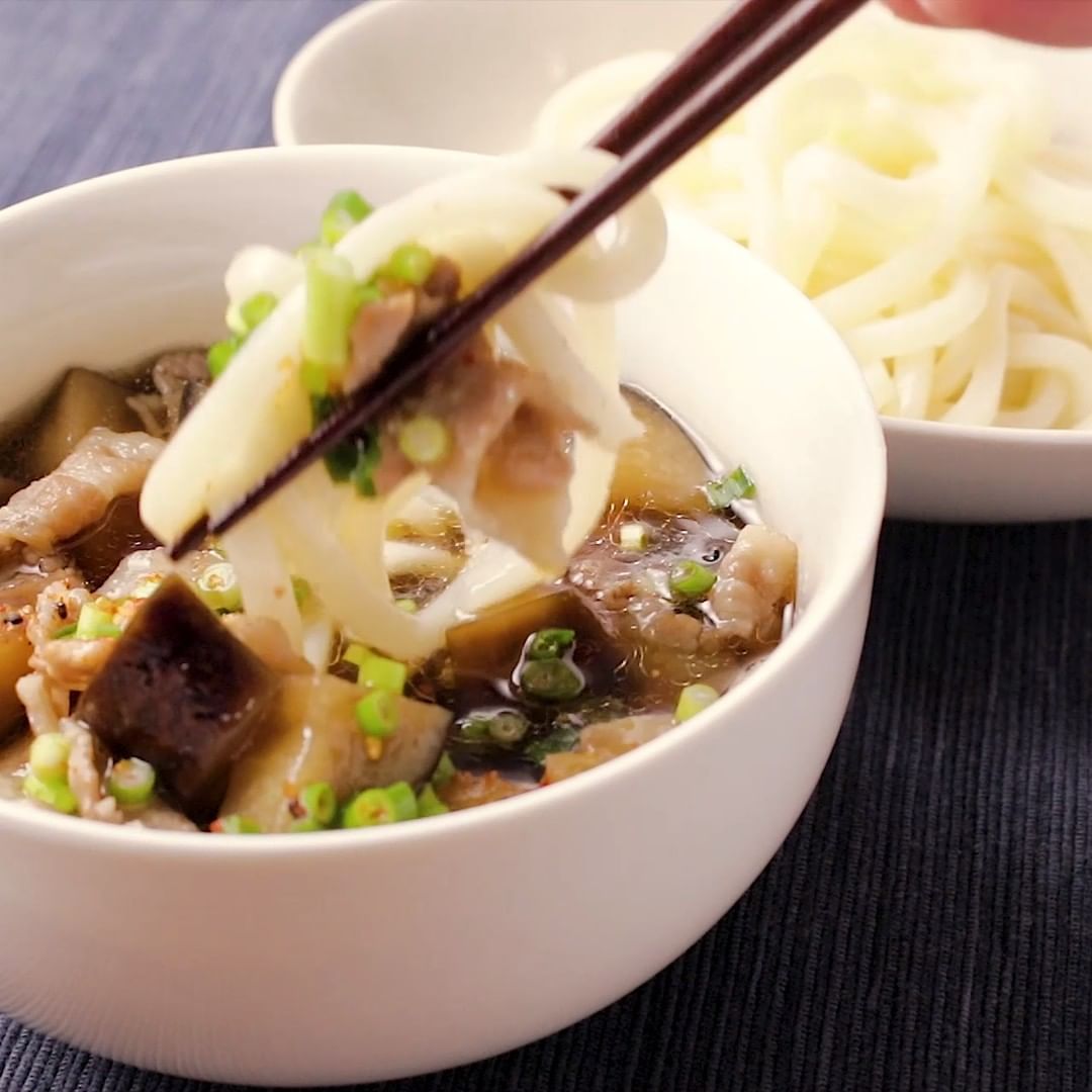 ①ごま油香る なすと豚バラのつけうどん