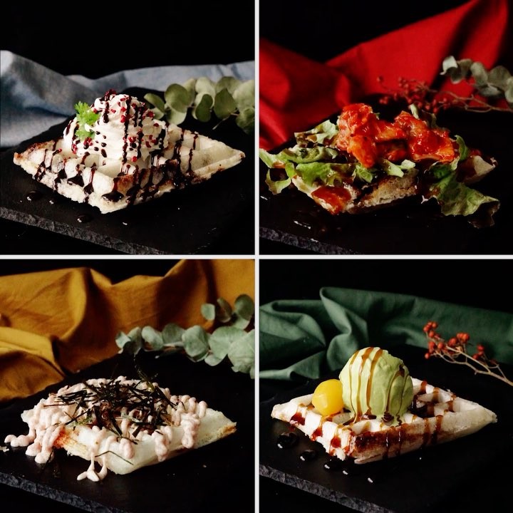 1. お餅を2枚づつワッフルメーカーに乗せ、はみ出ないように具材をのせる。