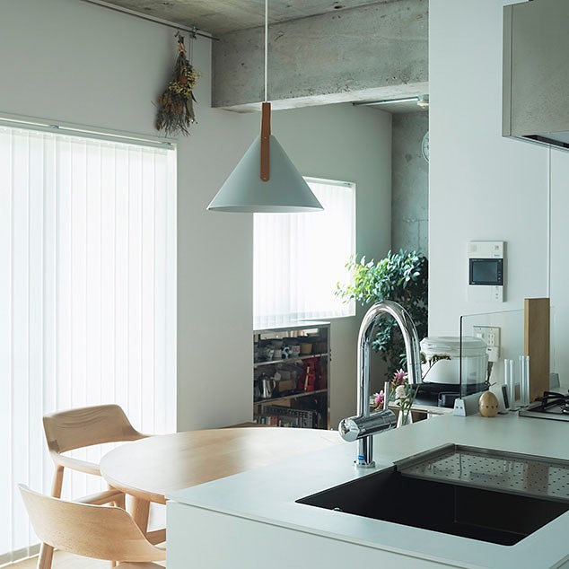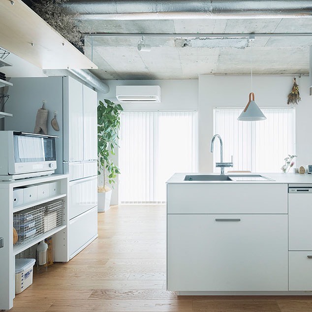 「広い空間を生かした、動線がすっきりした清潔感のある住まいにしたいと思いました。とくにキッチンをどこに置くかはものすごく迷いました。結果的に、玄関を入ってすぐキッチンがある間取りになりましたが、実際に暮らしてみても、いい感じですね」と話すお2人は、完成した住まいには満足しているそうです。