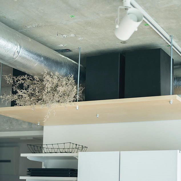 壁面や天井にコンクリートの駆体を残した内装が印象的です。