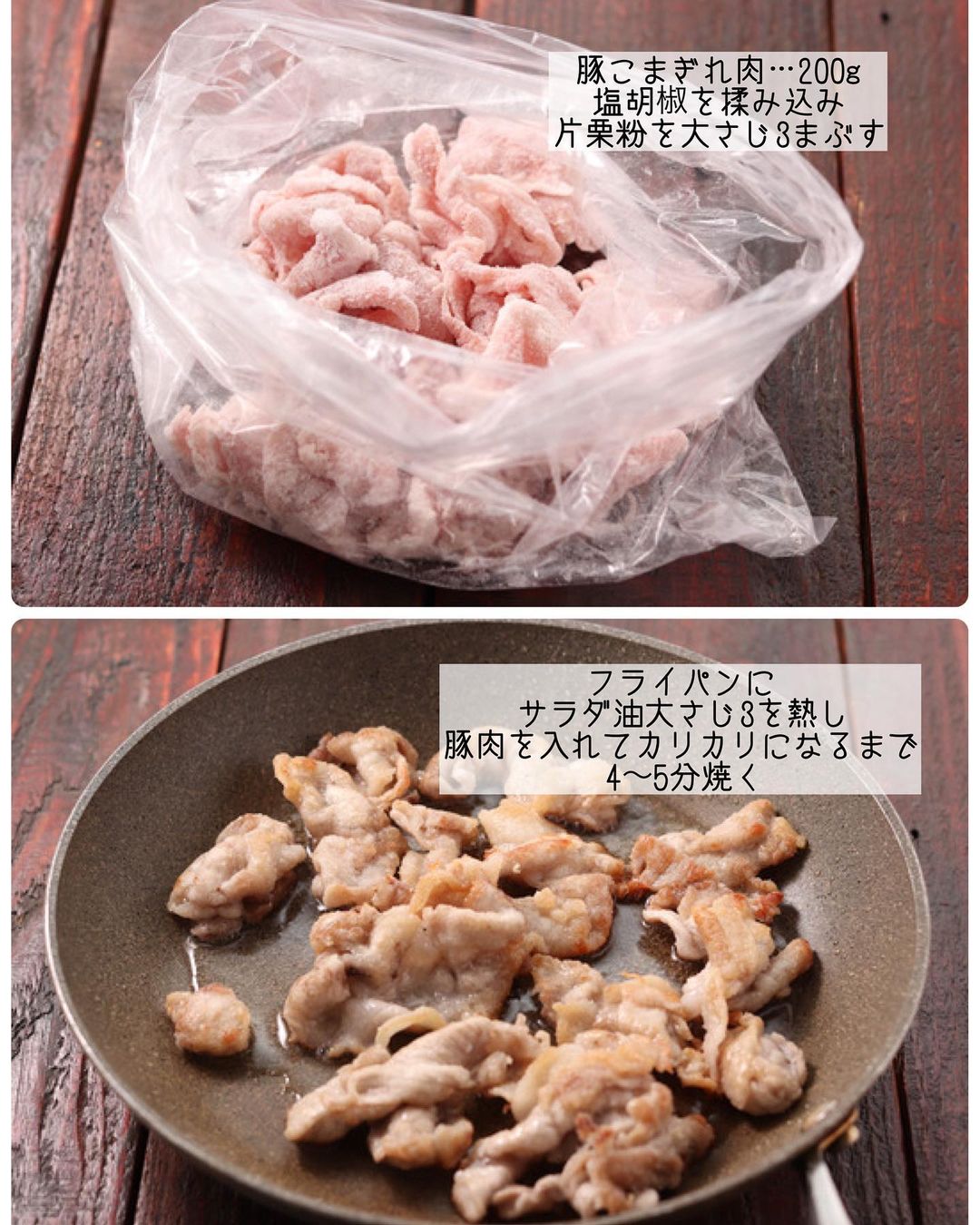 ➊豚肉はポリ袋に入れ、塩・こしょうを揉み込む。片栗粉を加えて口を閉じ、上下にふってまんべんなくまぶす。