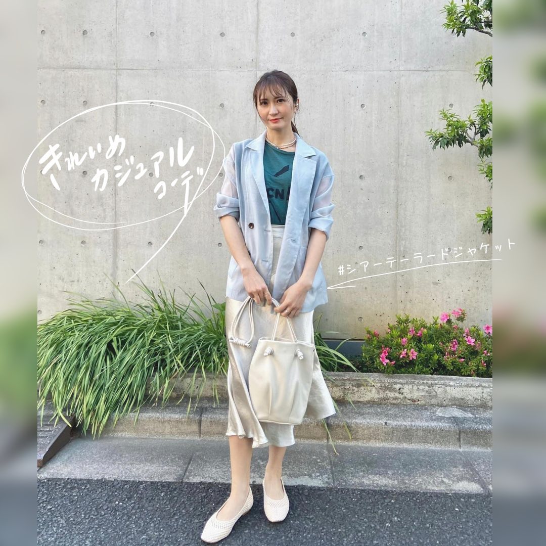 ブルーの透け感が、涼やかで綺麗✨ジャケットを羽織るだけで、大人フェミニンなスカートスタイルが、更に格上げ👏とっても素敵ですね🥰お洒落度アップする、シアーテーラードジャケット👌是非、チェックしてみてくださいね🙌💕