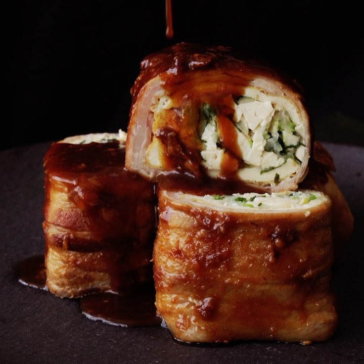 5. 1の中に4を詰め、豚肉で巻く。