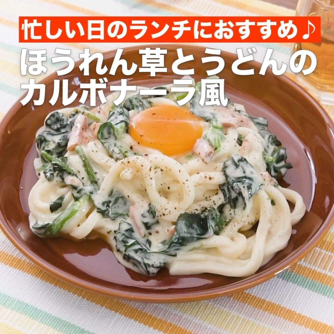 ⑥<忙しい日のランチにおすすめ♪ほうれん草とうどんのカルボナーラ風>