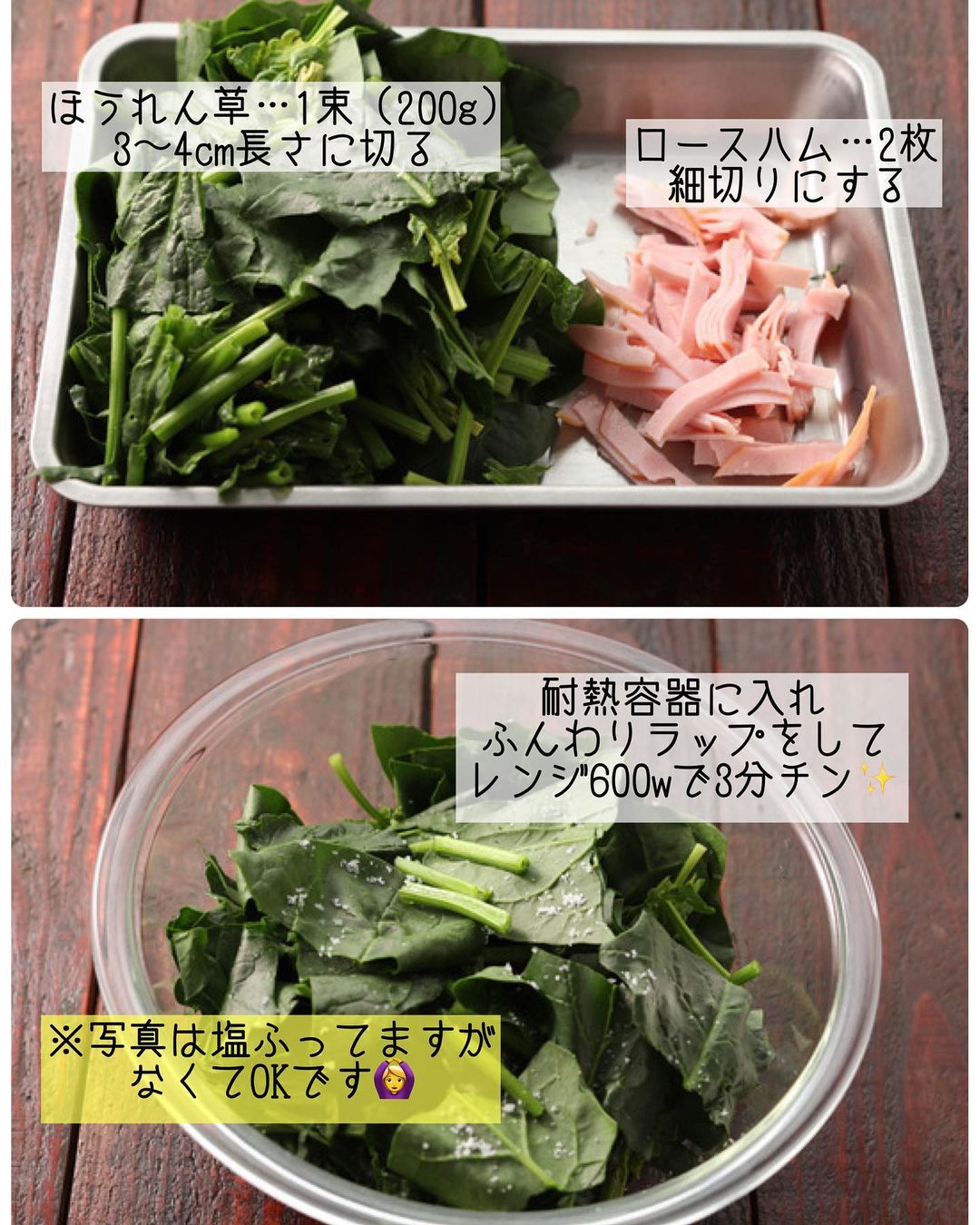 ➋耐熱容器にほうれん草を入れ、ふんわりラップをする。電子レンジ600wで3分ほど加熱し、冷水にとって水気を絞る。
