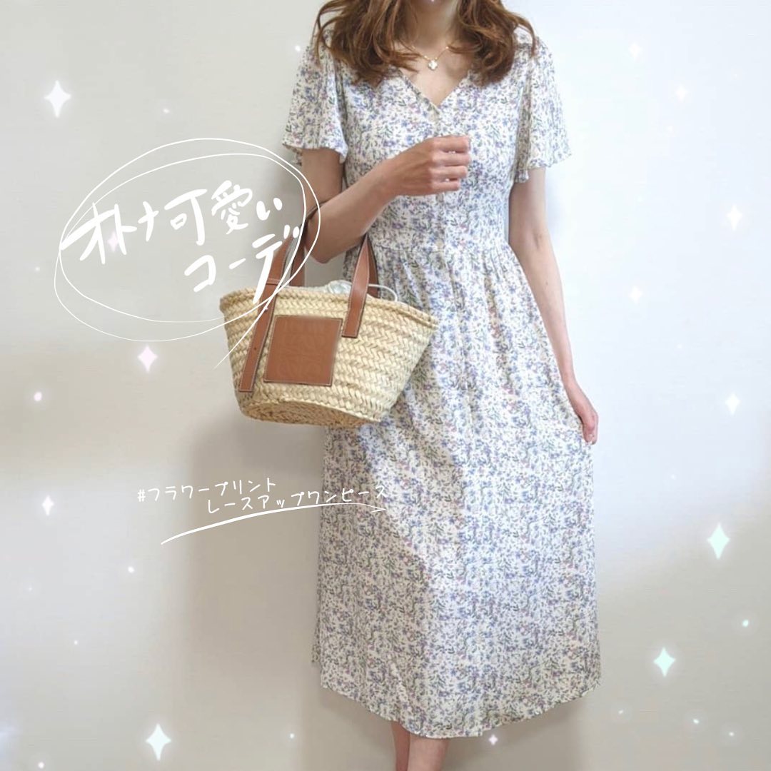 GUオトナ可愛いコーデをPick up!小花柄の可憐なワンピースに、カゴバッグを合わせた、ひと足先に夏を感じるスタイリング🥰品と甘さをふんわりとMIXして😘とっても可愛いです👏背中のレースアップで、ウエストラインを調整できる、シルエット自在の嬉しいワンピ🙌