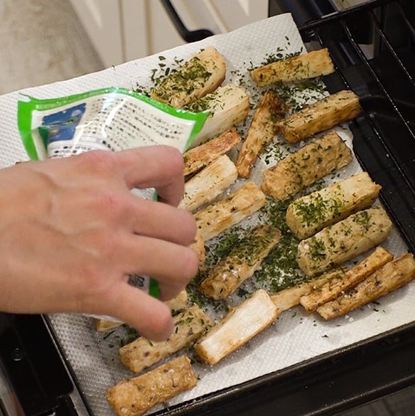 ⑤魚焼きグリルの上にキッチンペーパーを敷き、揚げた長芋をのせ油を切る