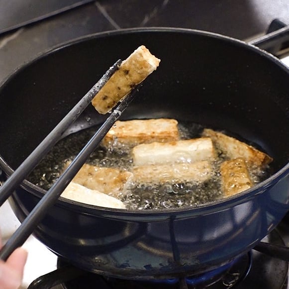 ③フライパンの底から1cm程度の深さまで油を入れ火にかける
