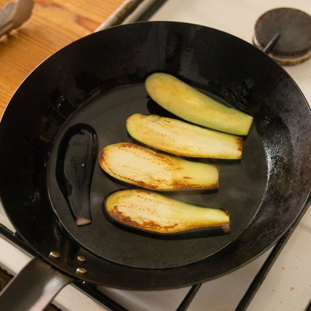 2.フライパンでオリーブオイルを温め、なすの両面を中火で焼き、取り出します。