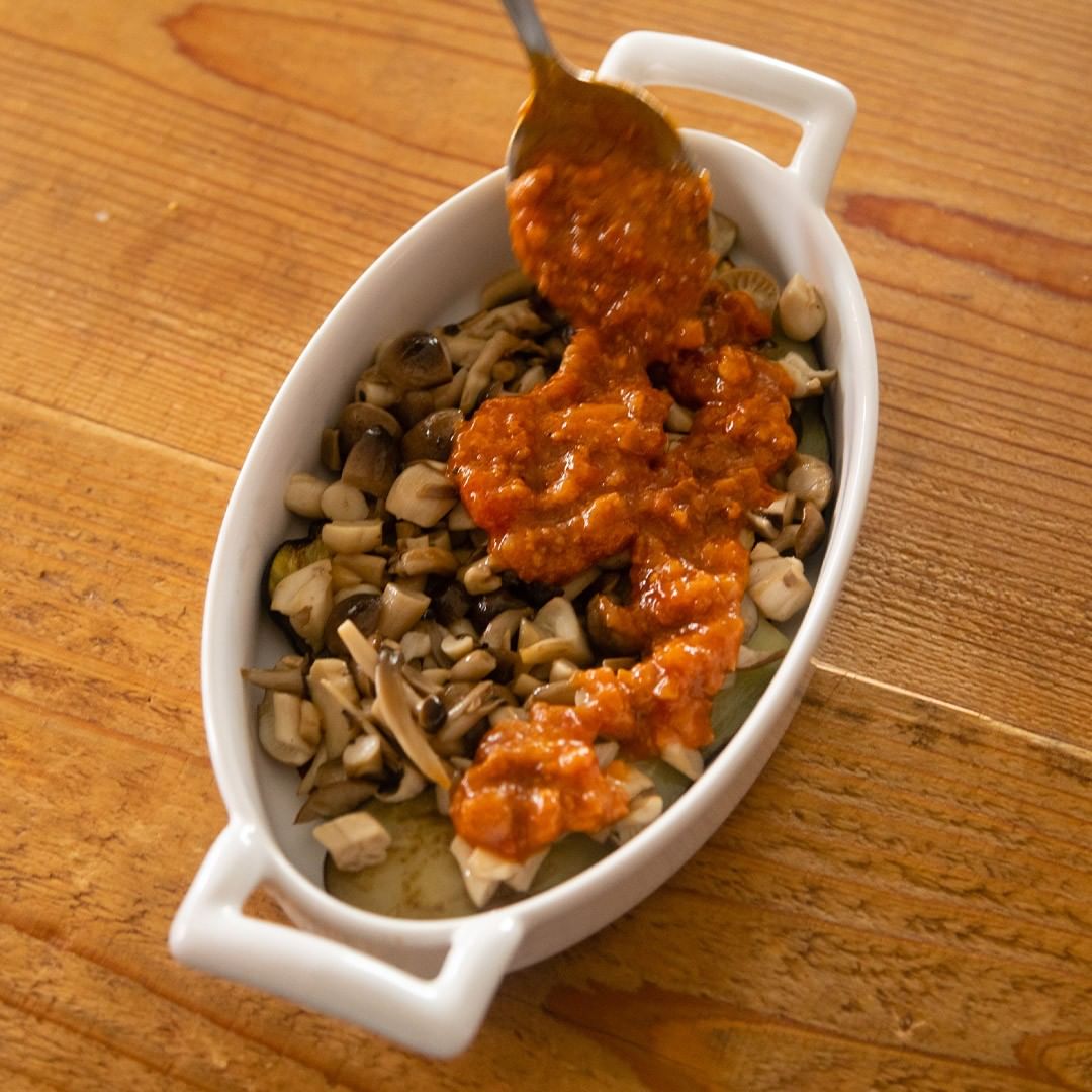 4.グラタン皿になすを半分敷き詰め、しめじと「素材を生かしたパスタソース 国産牛と黒豚のボロネーゼ」を入れ、黒こしょうをふったら、更になすを重ねます。
