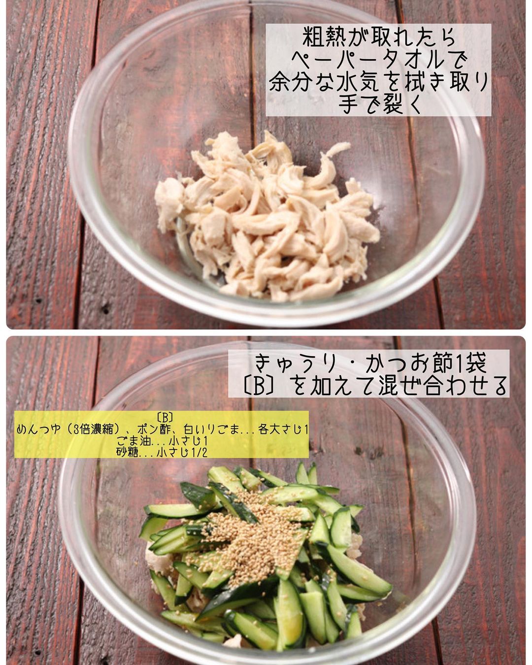 ➌ペーパータオルで容器内の余分な水気を拭き取り、ささ身を手で裂く。きゅうり・かつお節・〔B〕を加えて混ぜ合わせる。
