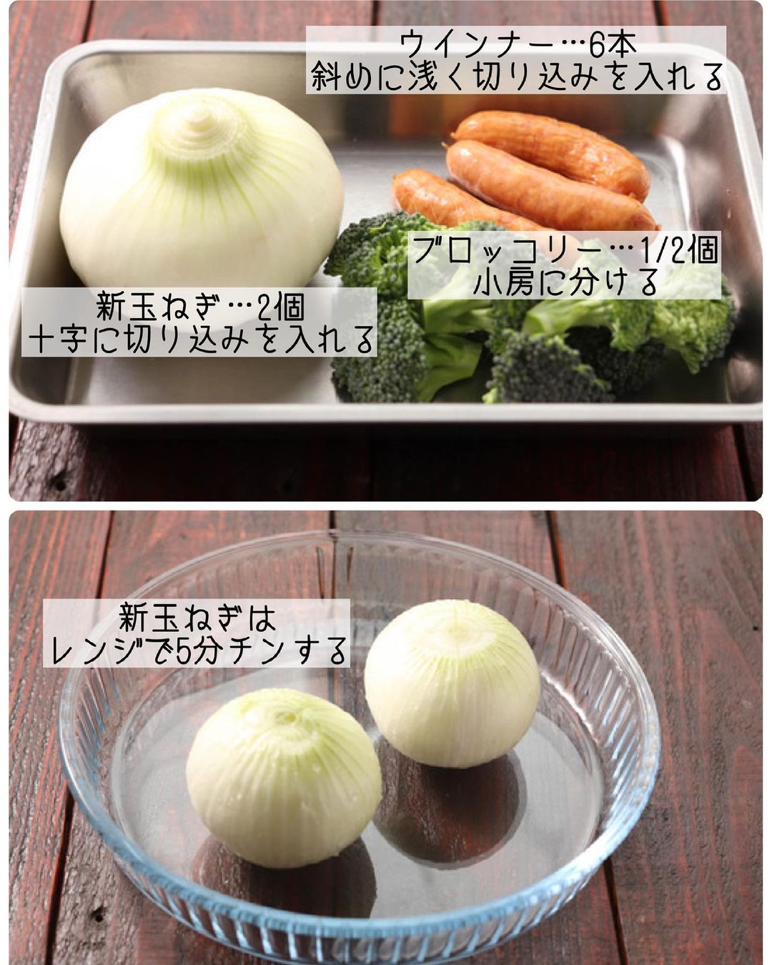 ➊新玉ねぎは、頭とお尻を薄く切り落とし、頭の部分に1cm深さに十字に切り込みを入れる。ブロッコリーは、小房に分け、ウインナーは斜めに浅く切り込みを入れる。