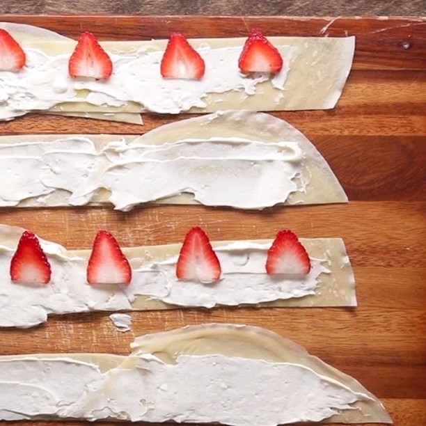 6. まな板の上に、長方形の生地と半円の生地を2枚セットにして少し重ねて並べ、(3)を塗っていちごを並べたら、端から巻く。