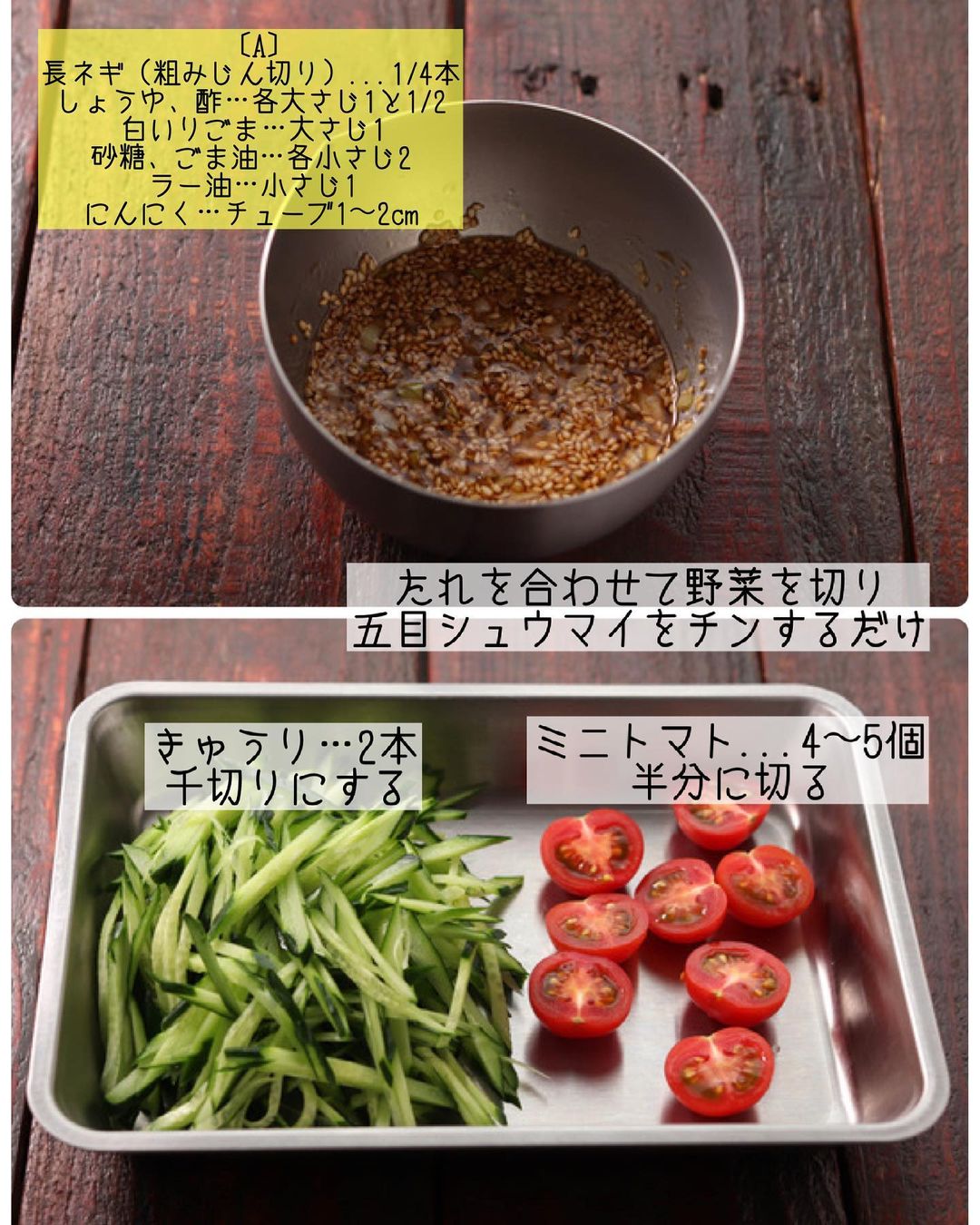 ➊五目シュウマイは、袋の表示通りレンジ加熱する。きゅうりは千切りに、ミニトマトは半分に切る。〔A〕は合わせる。
