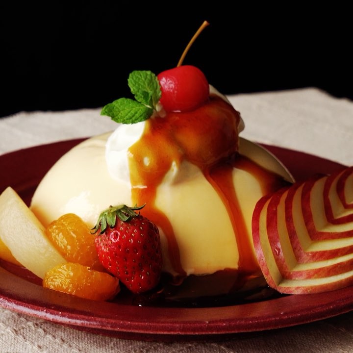 5. 冷めたプリンを型から取り、生クリームやカラメルソース、フルーツなどを飾る。