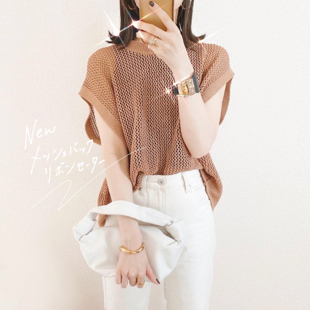 人気の、メッシュ編みの #メッシュバックリボンセーター ✨ゆるっと重ねるだけで、大人カジュアルな着こなし👌肩の落ち感が、とってもいい感じ👏可愛いですね🥰バックリボンがポイントのサマーニット🙌是非、チェックしてみてくださいね💁♀️💕